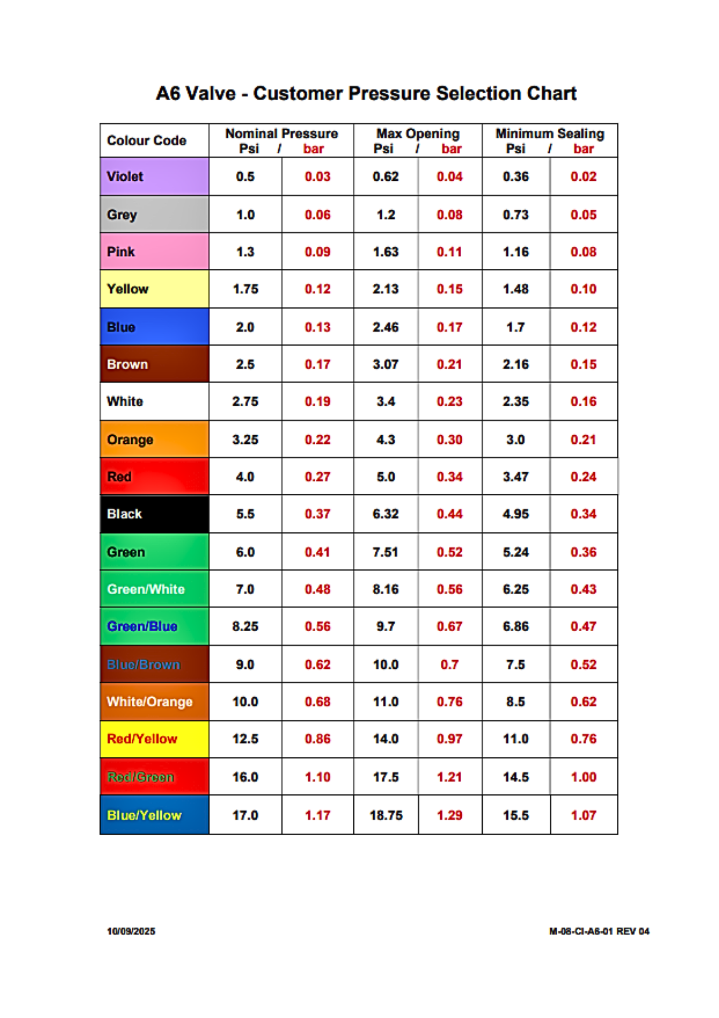 Disponible en ligne en 4 psi, 3,25 psi et 2,5 psi, mais une gamme de réglages de pression est disponible et les détails de ceux-ci se trouvent sur notre site Web principal. Les vannes sont marquées avec la date et le réglage de la pression. Si d'autres réglages de pression ou couleurs vous intéressent, veuillez remplir un e-mail de demande et nous vous répondrons.